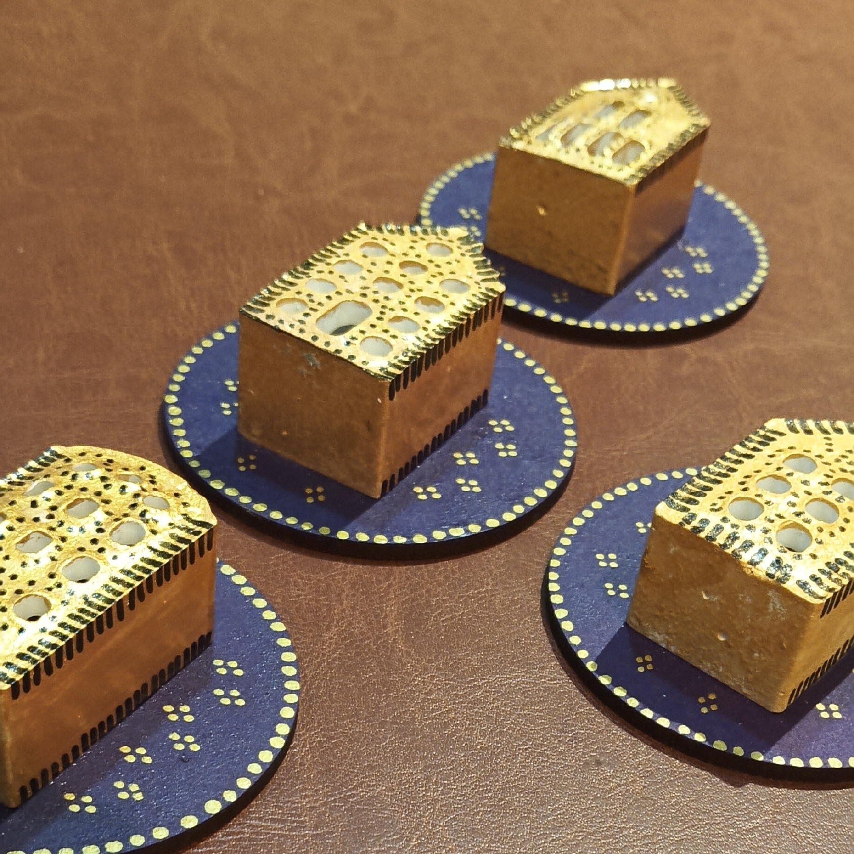 - HANDCRAFTED DESIGN: Beautiful set of 4 handmade and handpainted 3D mud houses mounted on 8 cm round MDF boards in royal purple and gold color scheme