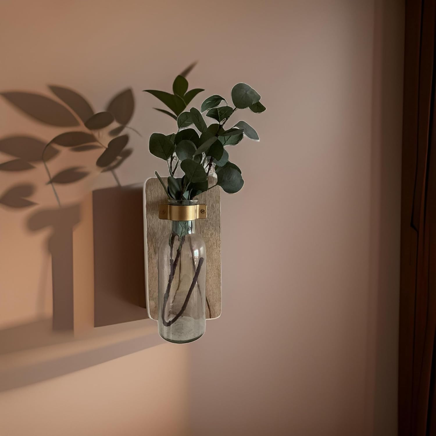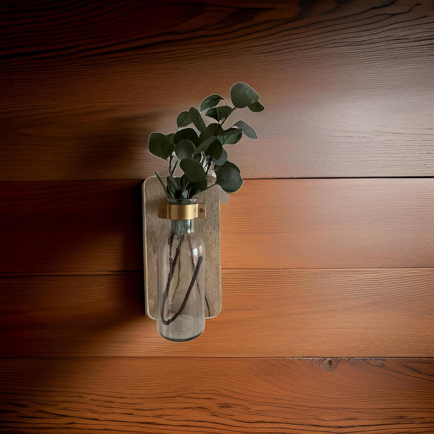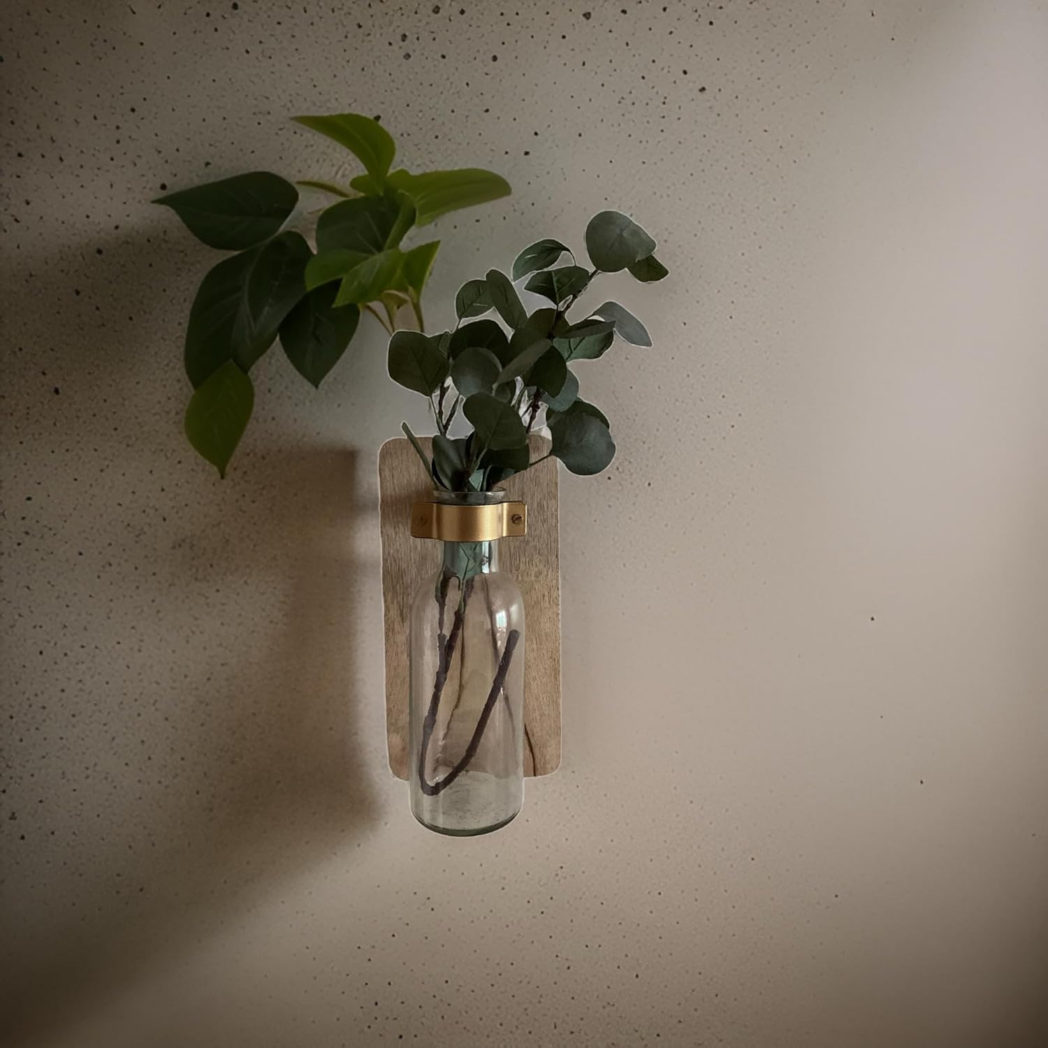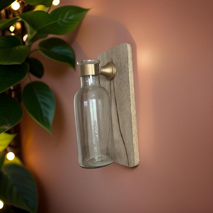 DEEMEETASTIC Wood and Glass Wall Hanging Elevate your home decor with the DEEMEETASTIC Wood and Glass Wall Hanging. Featuring a beautifully crafted wooden base, a sleek glass bottle, and sturdy metal clasps, this exquisite piece combines rustic charm with modern elegance, making it a perfect addition to any indoor or balcony space.
